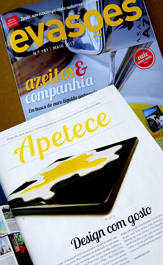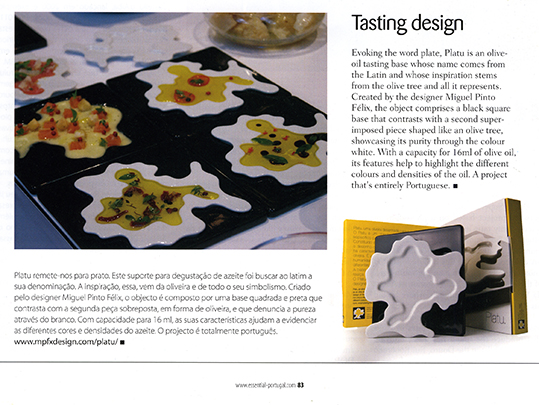 Platu, uma oliveira desenhada para o azeite. O Platu é um objeto de design original e funcional, específico para a degustação do azeite com o pão. Constituído por duas peças que se complementam, o desenho orgânico e expressivo do Platu é inspirado na característica moldável do azeite e na pureza da oliveira. É a pureza desta árvore, símbolo ancestral da humanidade, que justifica o branco da peça onde as diferentes cores e densidades do azeite se evidenciam. A base quadrangular, pintada de preto, emoldura e realça a peça branca destacando o seu desenho. O Platu é um projeto 100% português da autoria do designer Miguel Pinto Félix.