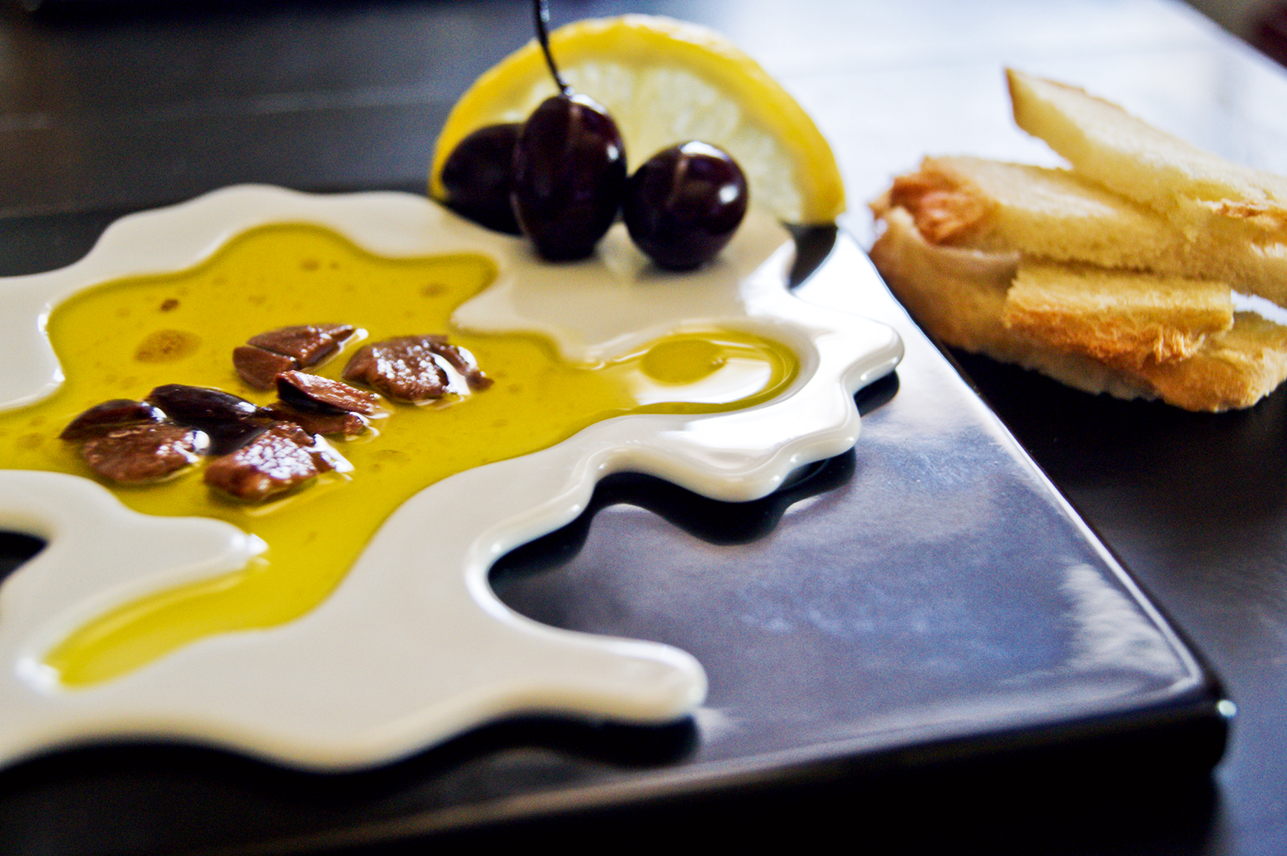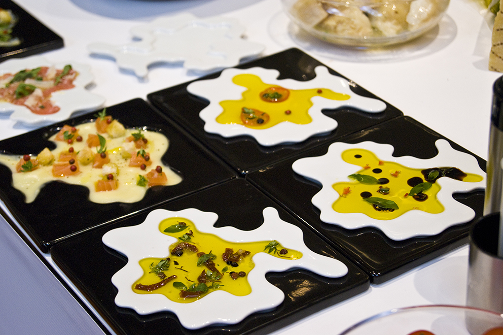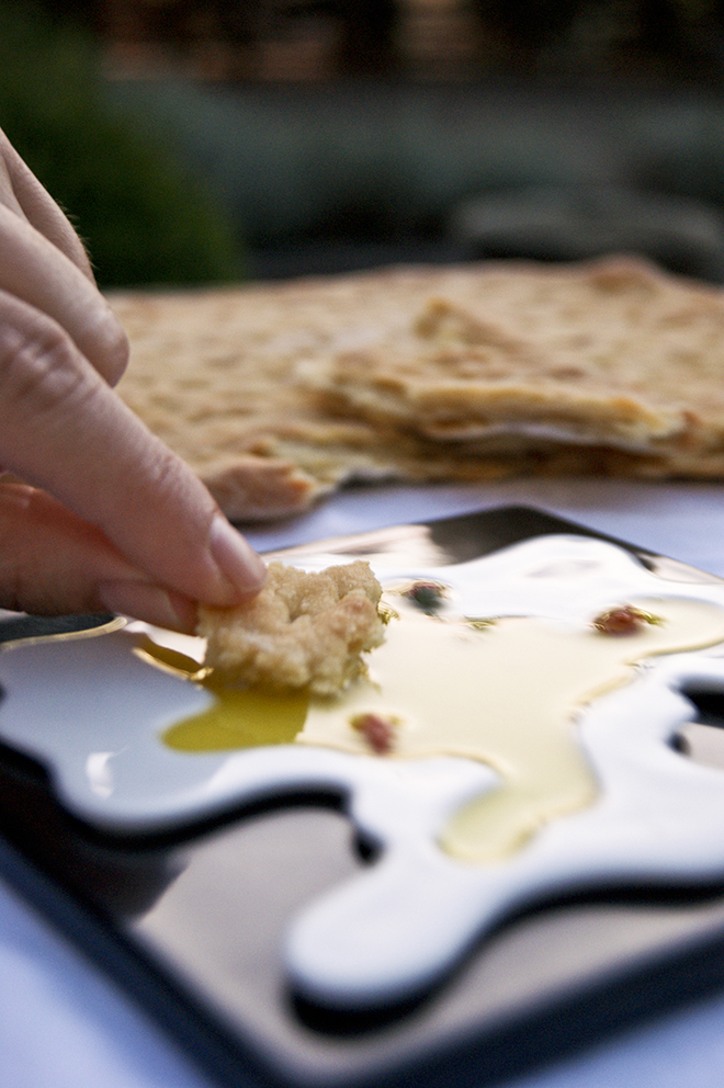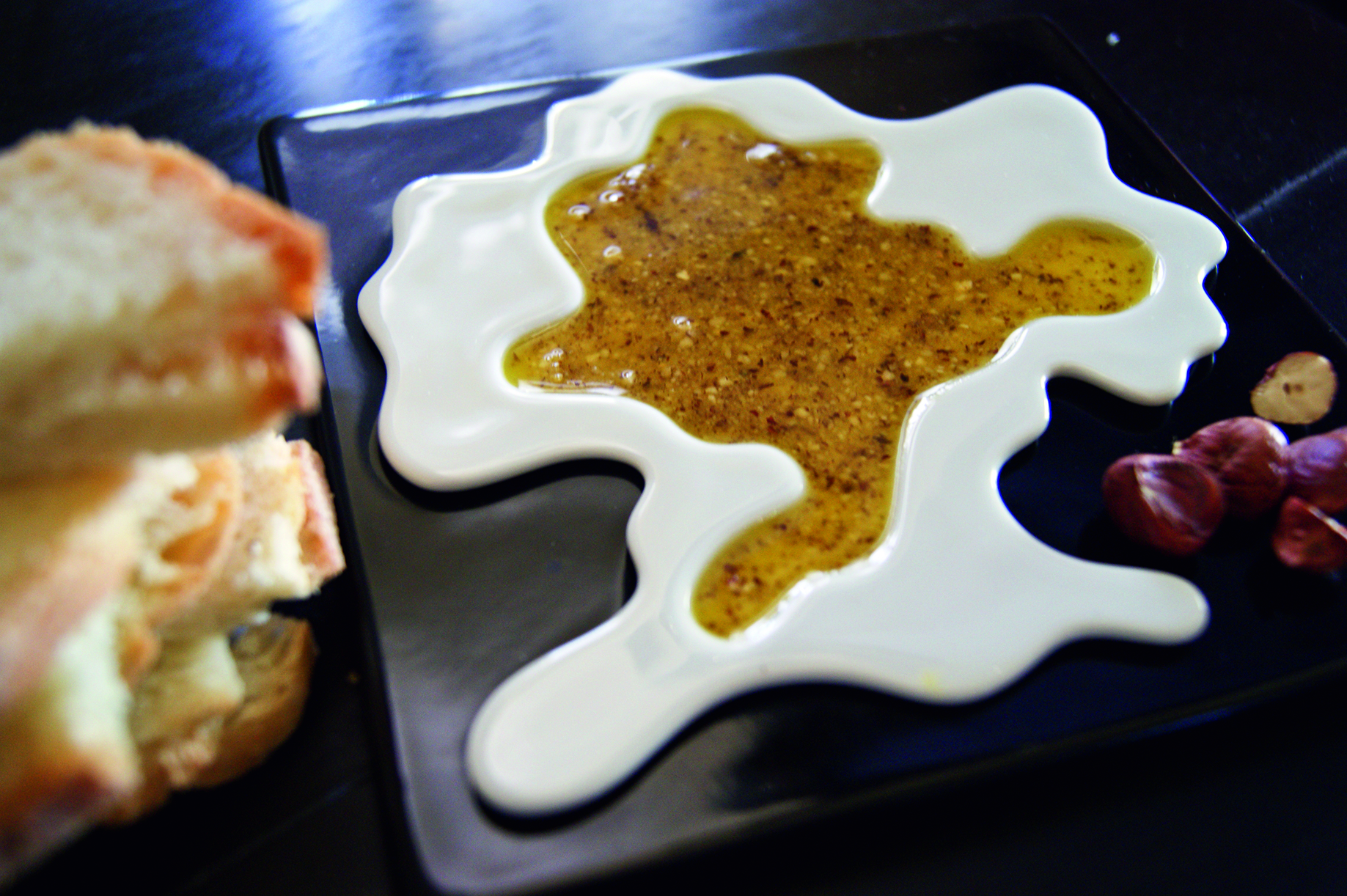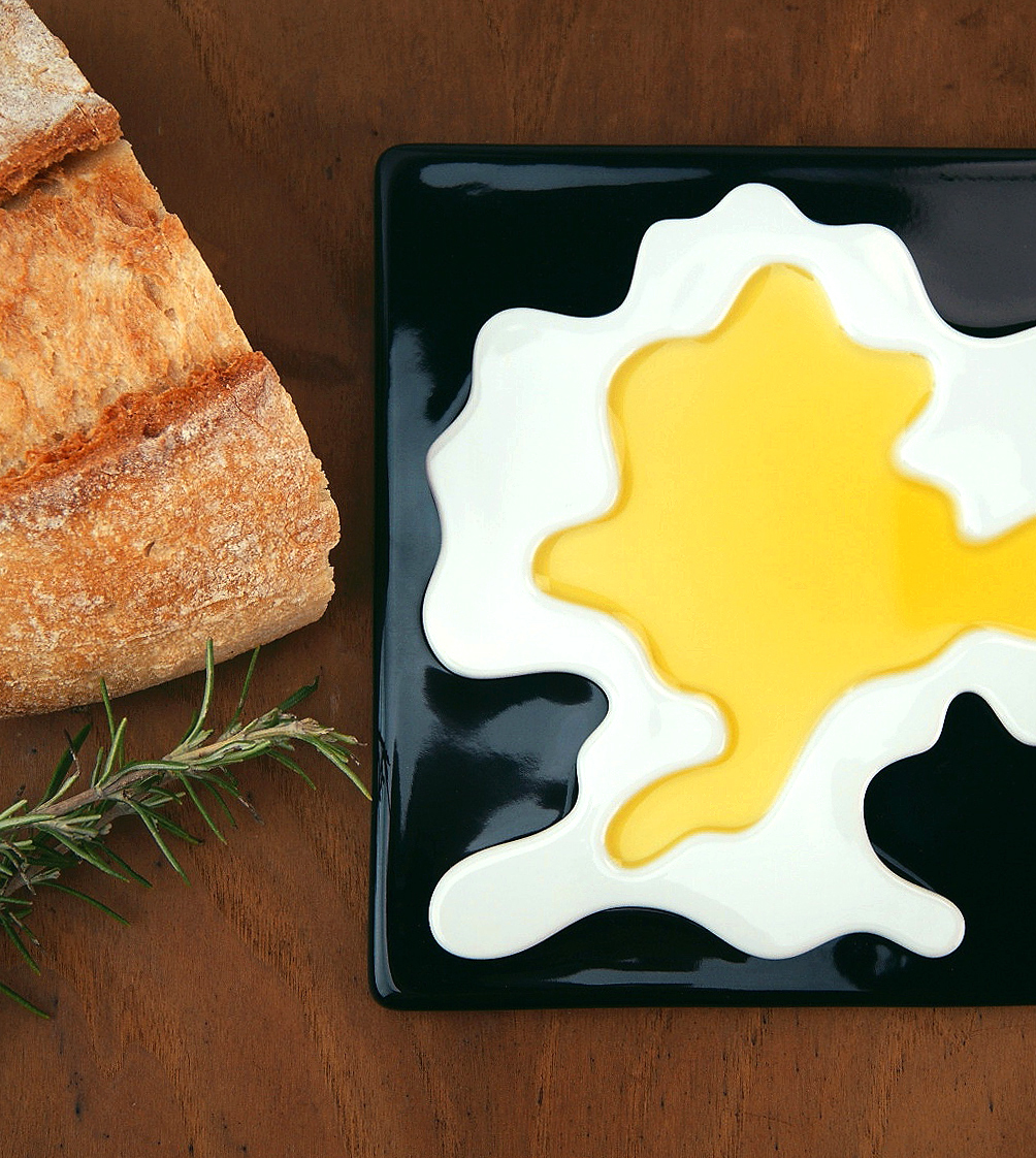 Platu, an olive tree designed for olive oil. The Platu is a unique and functional object specifically for use as an olive oil dish into which to dip bread. Consisting of two complementary parts, Platu’s organic and expressive design is inspired by the fluidity of olive oil and the purity of the olive tree. Its white colour not only refers to the purity of the olive tree, an ancestral symbol of mankind, but also serves to highlight the different colours and densities of the olive oil. The black-painted square base frames and enhances the white shape and emphasises the design.